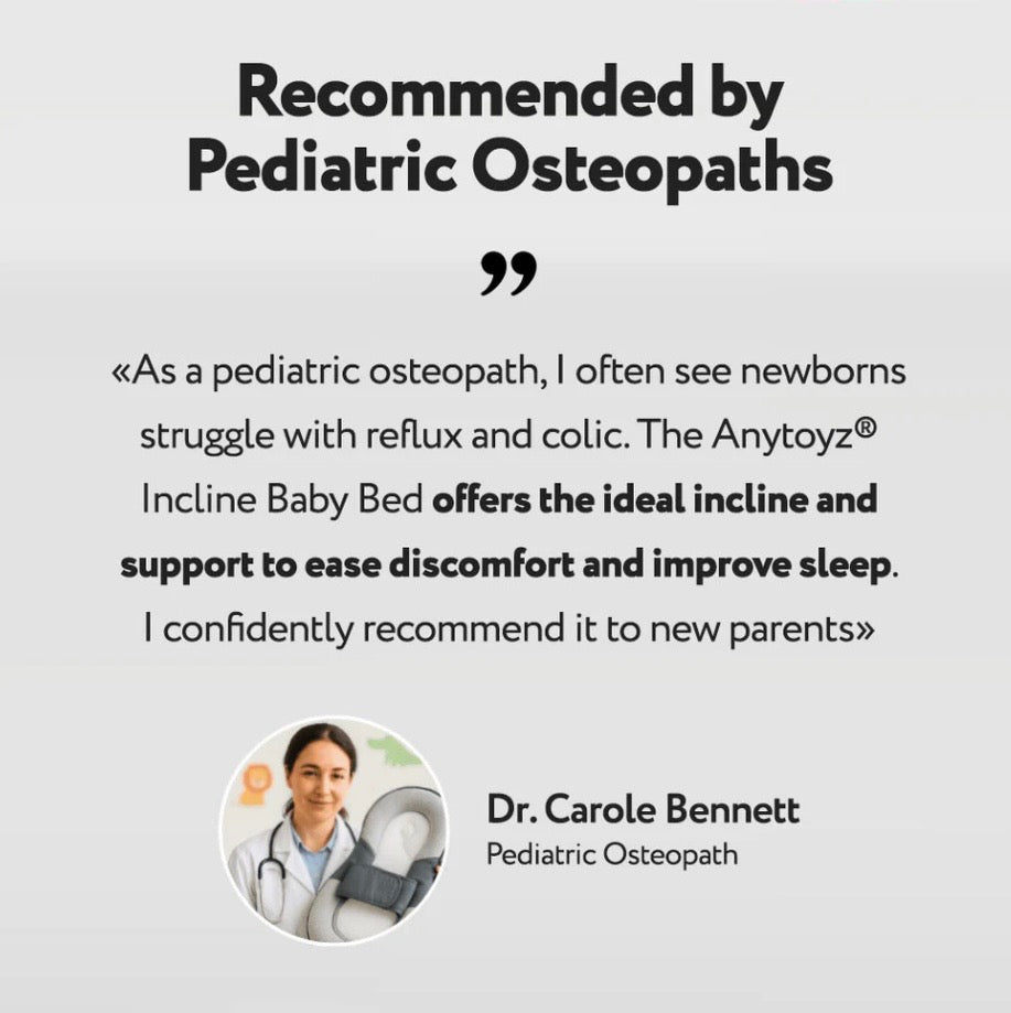 Anytoyz® Incline Baby Bed blends expert pediatric insights with smart, baby-friendly design to deliver unmatched comfort and safety all night long.